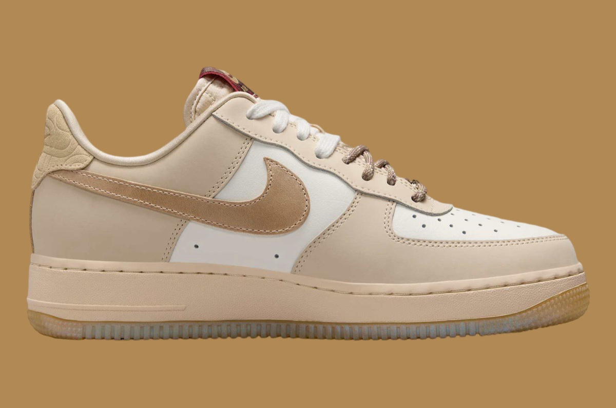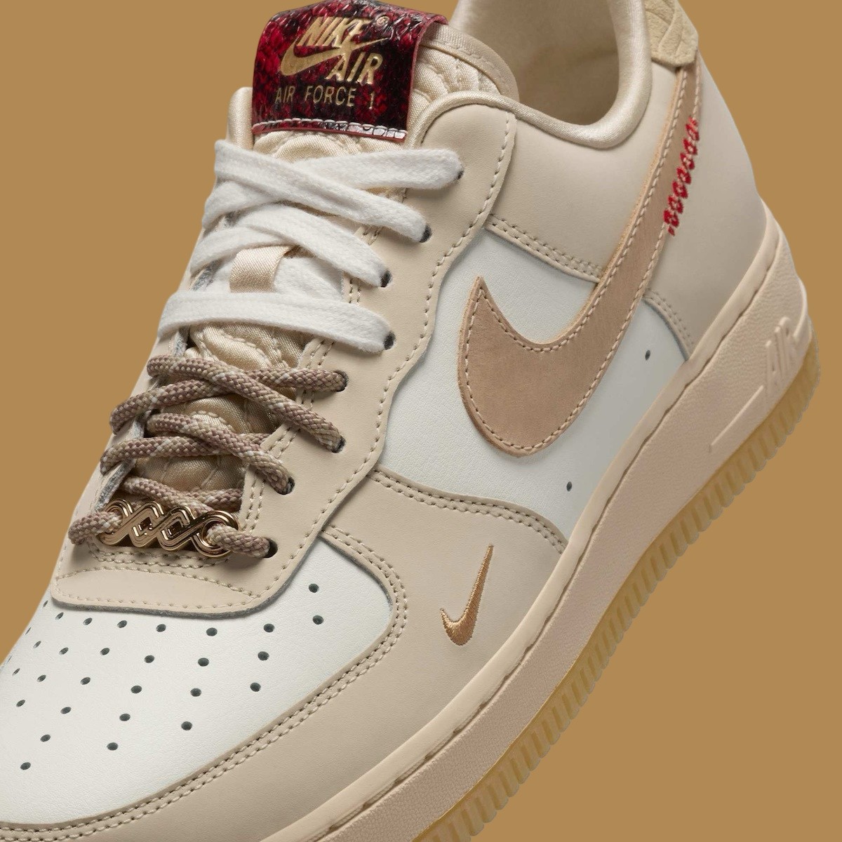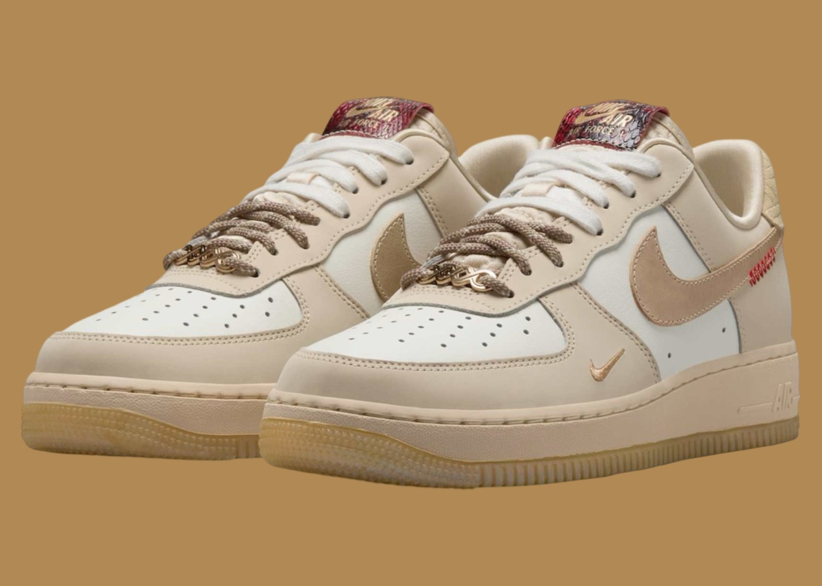 Upper: Premium leather upper in soft cream and beige tones, featuring iridescent faux snakeskin overlays and festive embroidery. Inspired by the Year of the Snake, the material mix adds bold texture and traditional symbolism with a luxurious twist.