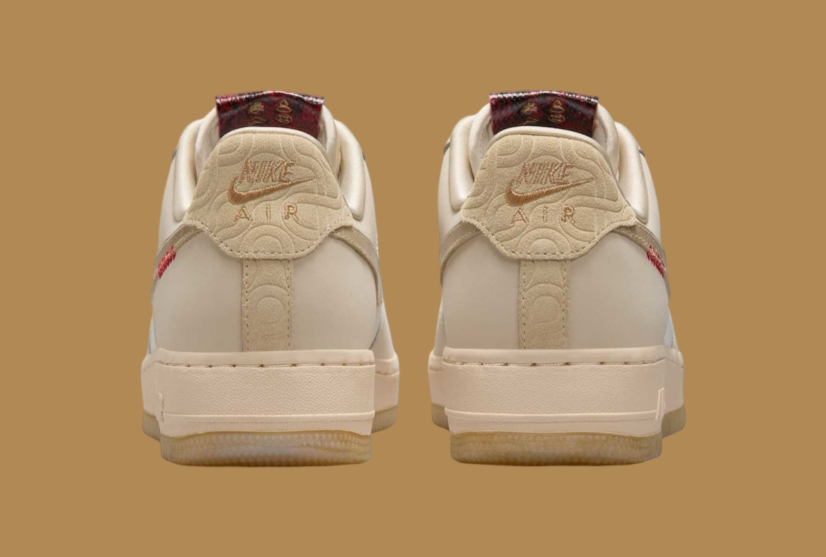 Sole: Crisp white Air Force 1 midsole with encapsulated Nike Air cushioning for comfort and bounce. The outsole features translucent detailing or snake-skin inspired patterns for grip and festive impact.